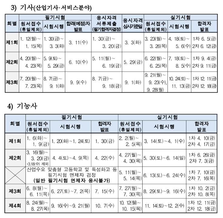 2026학년도 국가기술자격(기능사·산업기사·기사) 시험일정을 다음과 같이 교육생 및 학부모님께 안내드립니다. 기능사의 경우 1年 4회차, 산업기사(기사 포함)의 경우 3회차 실시될 예정입니다.